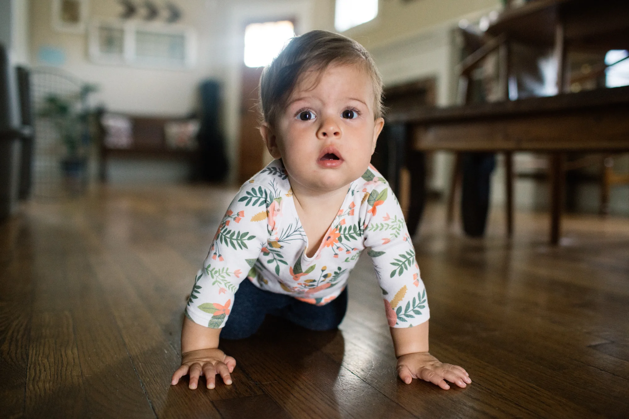 The crawl started with cute, little, disconnected scoots with a motivation to get closer to books. Now you chase after everything you see and want. You follow me, your Mom and Greta around the house. Your Mom makes sure that you're wearing pants to save your knees from the hardwood floors, but they're getting tough anyway. You're like a honey badger. Honey badger doesn't care about her knees. Honey badger crawls where she wants.
