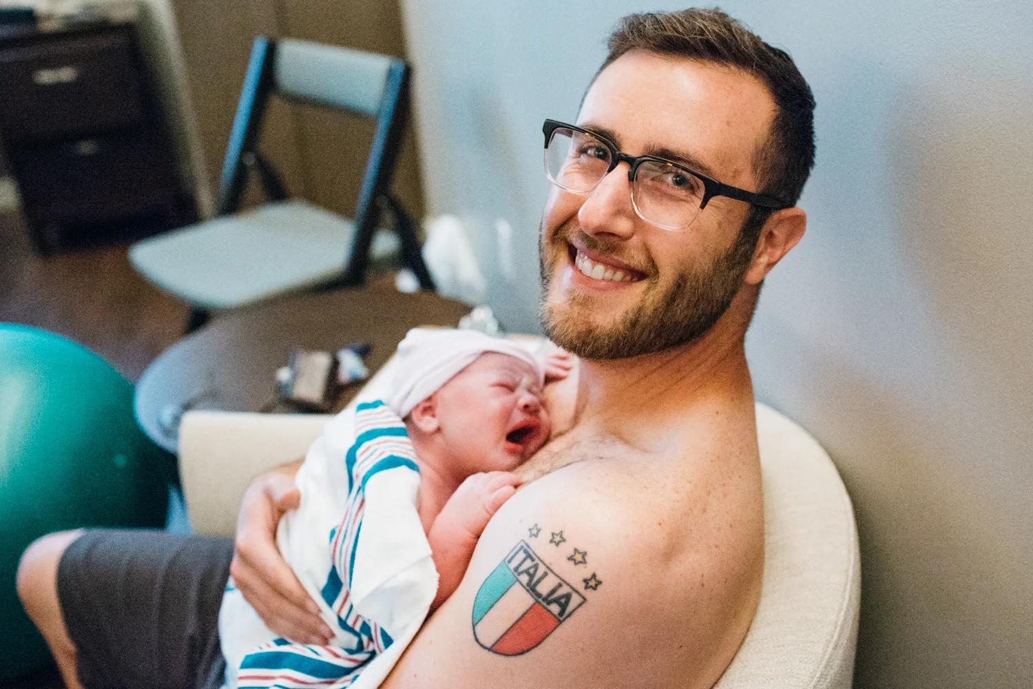 That was tough for me to watch. You were really limp. Your sister had a tough entry into the world, too. After a considerably long labor she was purple but had a good cry. You were nearly white, though it was hard to tell how much of that was vernix. Moreover it just took you more time to cry -- about a minute. You were trying but it just wasn't happening. They roughed you up some more, and we finally heard that cry we needed. I hugged the nurses immediately after hearing that first little noise. They rushed me to take off my shirt so you and I could have skin-to-skin time while your Mom was getting out of the tub and on the bed. I was so excited to get to hold you first! The doula took a first photo of us that I'll forever cherish.